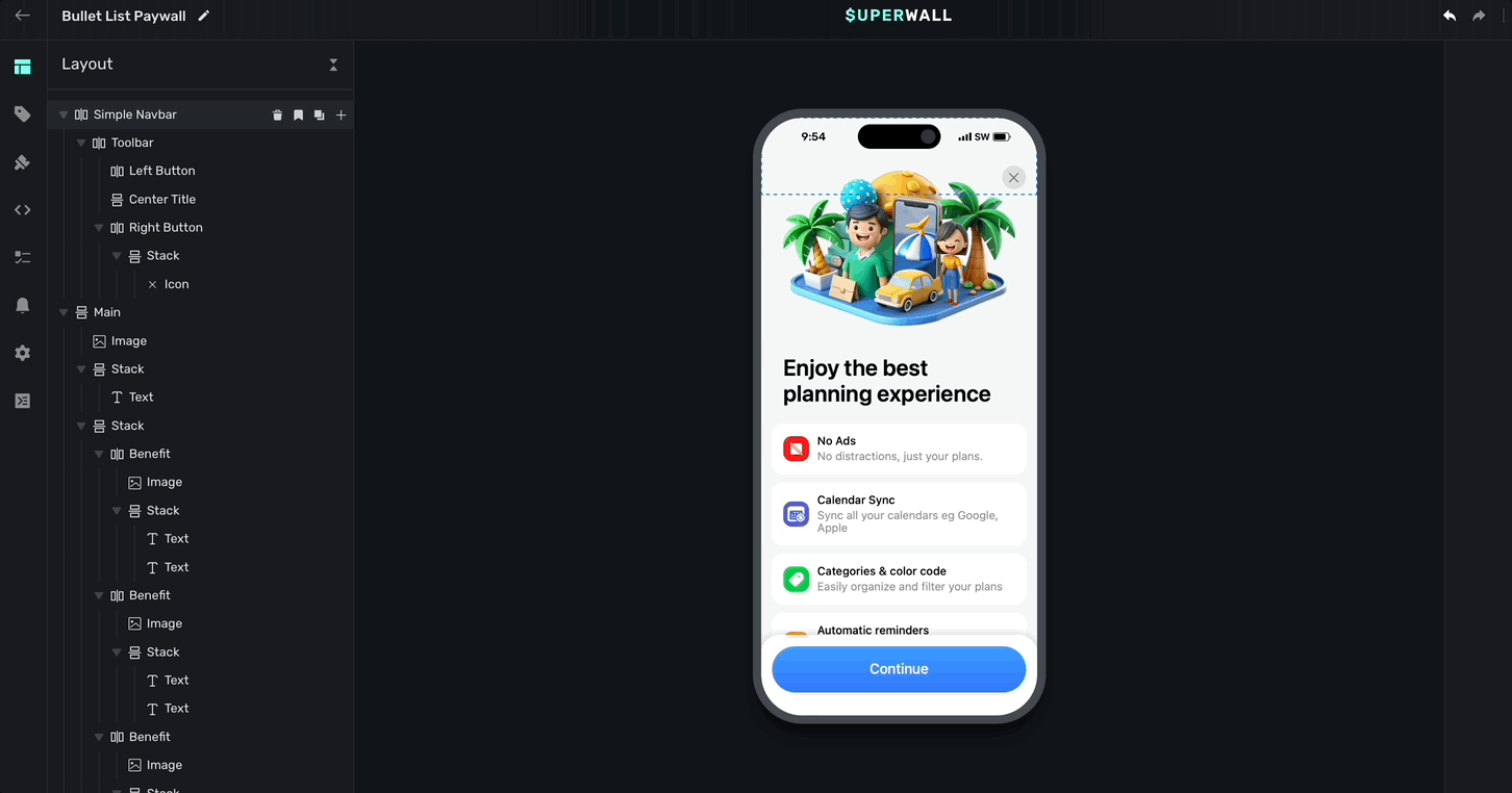 The Layout tab in the sidebar provides a visual outline of your paywall's components. Hovering over elements will highlight them in the device preview: