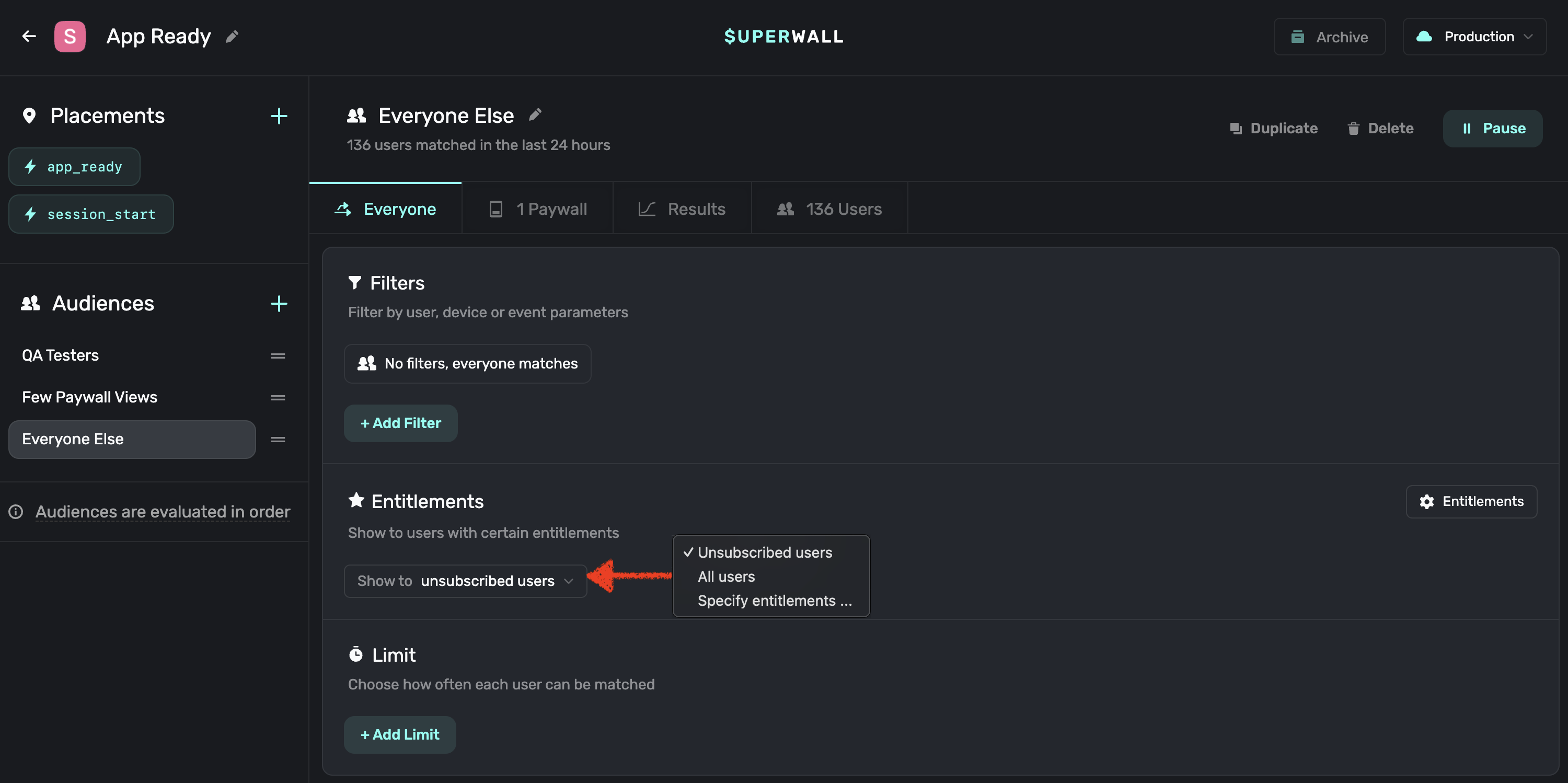 In the Paywall Editor you can choose whether to always present a paywall or ask the SDK to check the user subscription before presenting a paywall. For users on v1 of the SDK, this is replaced with a check on the entitlements within the audience filter. As you migrate your users from v1 to v2 of the SDK, you'll need to make sure you set both the entitlements check and the paywall presentation condition in the paywall editor.