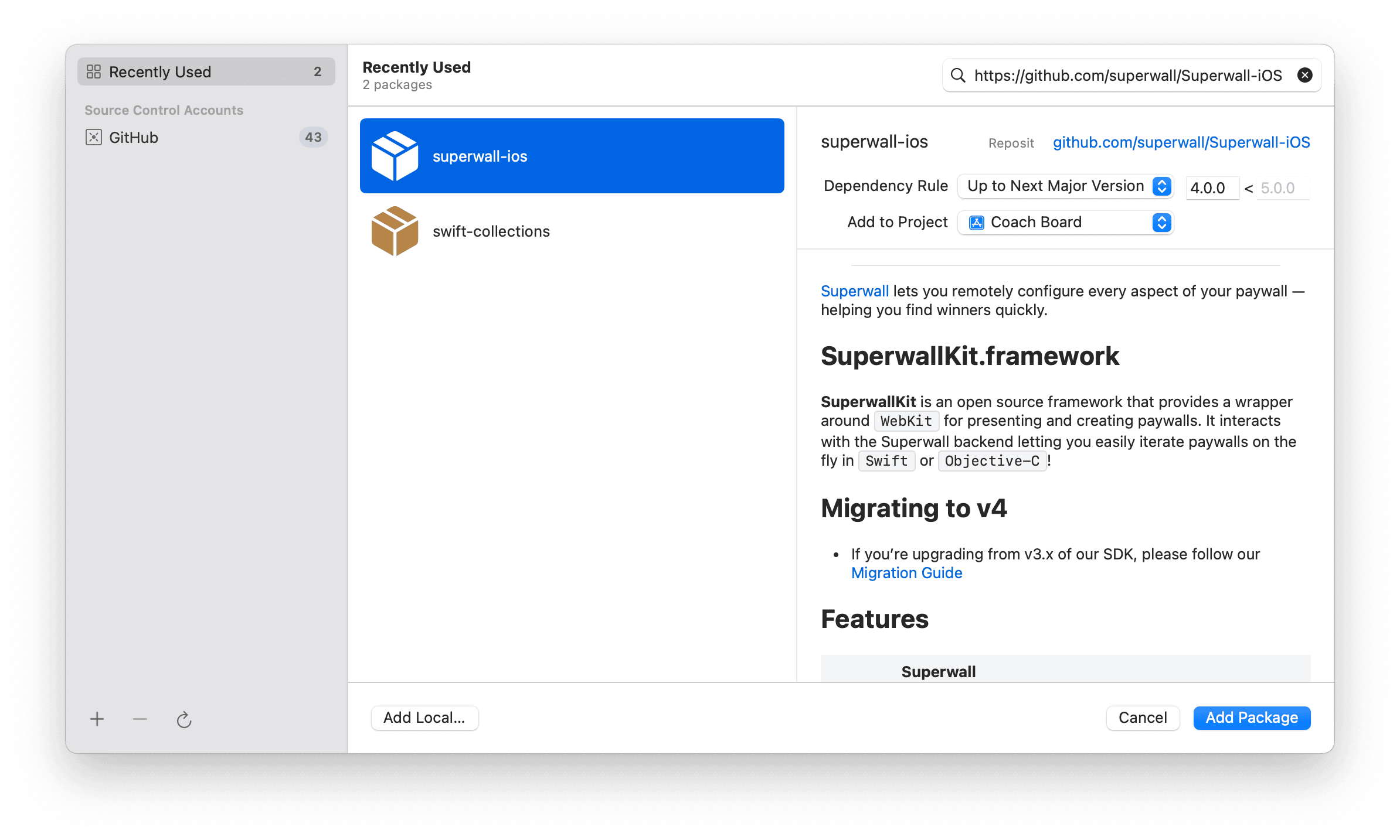 in the search bar. With the Superwall-iOS source selected, set the Dependency Rule to Up to Next Major Version with the lower bound set to 4.0.0. Make sure your project name is selected in Add to Project. Then click Add Package: